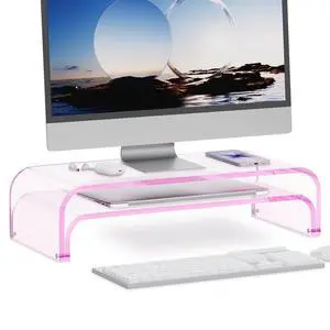 ERGO COLLECT Acrylic Dual Monitor Stand Riser 2 Tier, Modular Laptop Stand for Desk, Multifunctional Desktop Organizer Shelf for PC, iMac, Printer, Detachable Monitor Stand for Office or Home, Pink