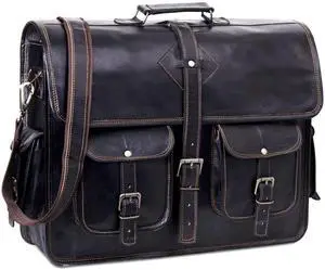 Vintage Leather Laptop Bag for Men Full Grain Large Leather Messenger bag for men 18 inches with rustic look Brown briefcase (Black)