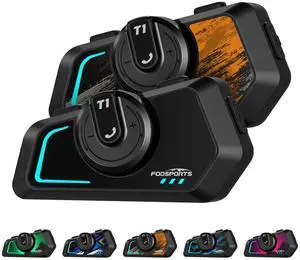 Fodsports T5 Motorcycle Bluetooth Headset with Music Sharing, 2 Riders Helmet Intercom Communication Systems, 9-Language Voice Prompts/Voice Assistant/FM Radio/2 Type Mics/4 Colored Faceplates