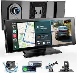 WonVon Wireless Car Play Screen, 10.26'' Monitor with Apple Carplay & Android Auto, 4K Dash Cam 64G, 1080P Backup Camera, Portable Smart Touch Tablet Stereo Multimedia Dashboard, Bluetooth/FM/GPS/AUX