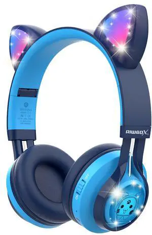 Riwbox CT-7 Cat Ear Bluetooth Headphones, LED Light Up Bluetooth Wireless Over Ear Headphones with Microphone and Volume Control for Travel/School/Smartphones/Laptop/PC/TV (Blue)