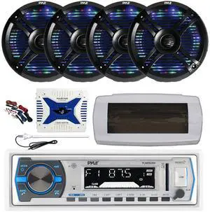 Pyle PLMRB29W Single DIN Bluetooth Marine MP3 AM/FM Stereo Receiver with White Cover, Long Range Antenna, Amplifier w/Kit, 4x 6.5" 250 Watt Max 2-Way Waterproof Multicolor LED Audio Speakers (Black)