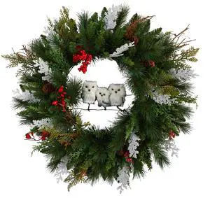 Nearly Natural 24" Holiday Owl Family Pinecone Berry Christmas Wreath