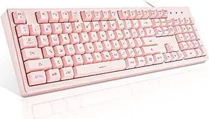 basaltech pink keyboard with 7-color led backlit, 104 keys quiet silent light up keyboard, 19-key anti-ghosting cheap gaming keyboard mechanical feeling waterproof wired usb for computer, mac, laptop