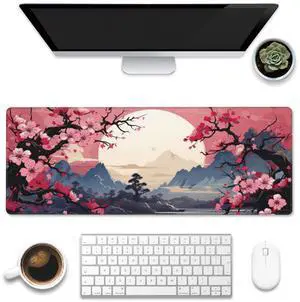 Pink Cherry Blossom Japanese Large Mouse Pad, Desk Mat Computer Keyboard Pad Non-Slip Rubber Base Waterproof with Stitched Edges for Laptop Gaming, Office & Home 31.5 x 11.8 Inch