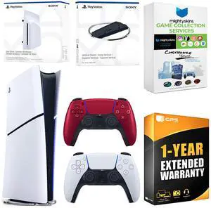 Sony PlayStation 5 Slim Digital Bundle with Disc Drive, Extra Controller, Vertical Stand, MightySkins Game Collection Services and 1 Year Extended Warranty - Volcanic Red