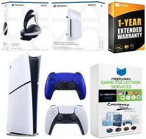 Sony PlayStation 5 Slim Digital Bundle with Disc Drive, Extra Controller, Pulse Elite Headset, MightySkins Game Collection and 1 Year Extended Warranty - Cobalt Blue