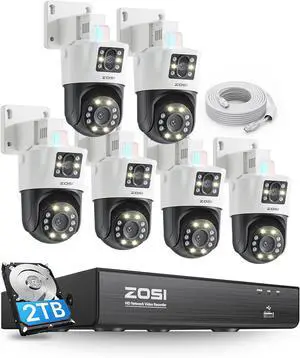 ZOSI 4K Dual-Lens PoE Security Camera System, 6 x 4K 8MP Pan/Tilt (2x4MP) PoE 360 Camera Outdoor, Person/Vehicle Detect, Spotlight Siren, Color Night Vision, 8CH 8MP NVR with 2TB HDD (16CH Expandable)