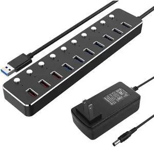 Aluminum Alloy 10 Ports USB 3.0 Hub Sub-control, 7*USB 3.0 Splitter 3*USB DC 5V 2.4A Fast Charging, Independent Power Switch LED Indicator Hub Extender, 120cm Cable With 12V 3A Adapter