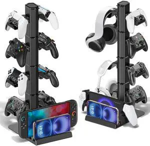 Gaming Headset & Controller Stand, Rotating Headphone Storage with Controller & Phone Holder, Game Desk Storage with Cable Organizer for PS5/PS4/XBOX PC Gamer Essentials Organizer Gift Accessories