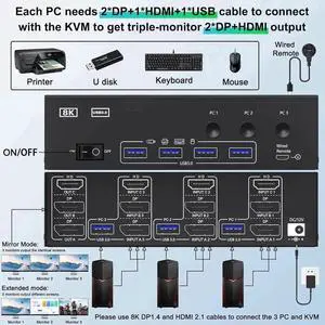 KVM Switch 3 Monitors 3 Computers 8K@60Hz, HDMI + 2* Displayport Triple Monitor KVM Switches for 3 Computers Share 3 Monitors and 4 USB 3.0 Devices, Wired Remote and 12V power adapter Included