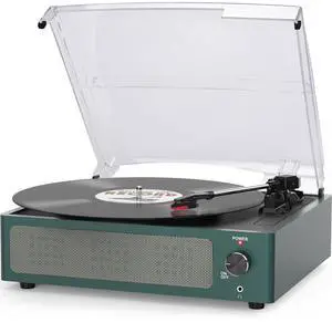 Vinyl Record Player with Speakers & Wireless Receiver Turntable for Vinyl Records 3 Speed 3 Size LP Player Portable Turn Table Vinyls Records Players Headphone AUX RCA Auto Stop New Sleek Dark Green