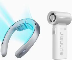 JISULIFE Portable Neck Fan Pro, 100 Speeds Bladeless, Stepless Knob, LED Display, 5000mAh Rechargeable Personal, Mini Hands Free, USB Battery Operated Wearable- Blue