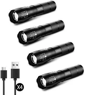 Specifications: High Lumens, Adjustable Light Modes, Adjustable Focus, Rechargeable, 9000 hours, lithium_ion, 4, 6.5 L x 1.65 W x 1.65 H inches, waterproof, 1 year manufacturer., ShineRover, A76 Flashlight Rechargeable-4P