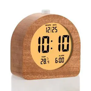 Wooden Digital Alarm Clock for Bedrooms, Wood 4'' Battery Powered Alarm Clock with Snooze and Nightlight, Electronic LCD Desk Clock Display Time, Date, Temp, 12/24H, Wood Décor, Round, Sapele