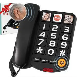 Extra-Loud (110dB) Landline Phone for Seniors & Hearing Impaired - Hearing Aid Compatible, Large Button Corded Phone with 3 Photo Speed Dial, Speakerphone - Black, Ideal Mother's