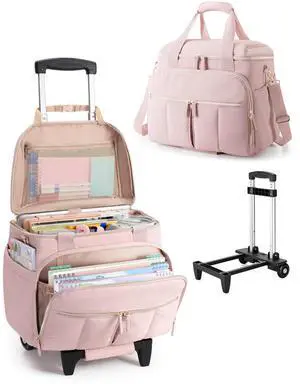 LUXJA Rolling Teacher Bag with Laptop Compartment and Detachable Dolly, Multifunctional Rolling Briefcase with Accordion File Area (Patent Pending), Pink