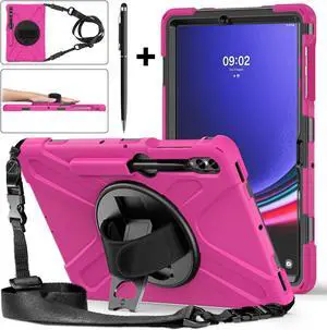 Protective Case for Samsung Galaxy Tab S9 Plus 2023 / S8 Plus 2022 / S7 FE 2021 / S7 Plus 2020 12.4 inch Tablet Shockproof Cover with 360 Degree Rotating Kickstand, Hand/Shoulder Strap Rose Red