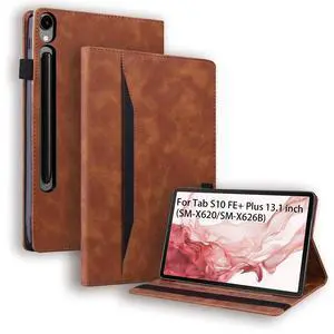 Flip Case for Samsung Galaxy Tab S10 FE+ Plus 2025 13.1 inch, PU Leather Stand Soft Back Smart Auto Wake/Sleep Cover,Adjustable Stand Shell w/Card Slots/Pen Holder/Front Pocket - Brown