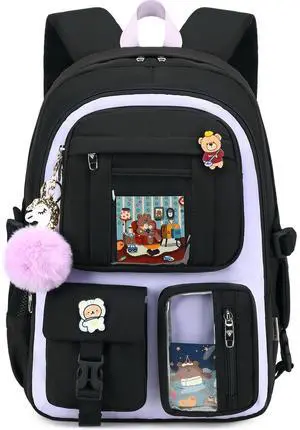 Backpack for Girls with Accessories Laptop Bookbags 16 Inch Kawaii Kids Elementary Middle High School Bag College Travel Daypack Gifts for Teens Women Students (Black Purple)