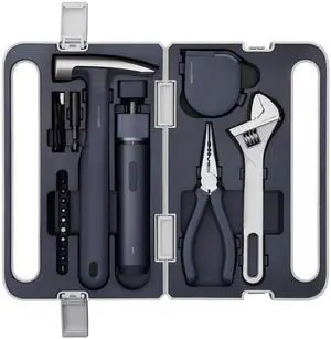 Brand: HOTOPart Number: QWDGJ001Type: Tool Kit Includes: 1 x electric screwdriver, 1 x adjustable spanner, 1 x claw hammer, 1 x rubber cap, 1 x 10 bit set, 1 x needlenose plier, 1 x self-lock measure tape, 1 x partable case.Size/Dimensions: 10.5 in x 6.6 in x 2.7 inModel #: 178747872482