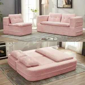 Multi Functional Sectional Sofa Bed with Independent Chaise Lounge and Functional Blanket,Plush Corduroy Sofa Couch,Convertible Sofa Bed,80" King Size Bed,Deep Seat Fluffy Sofa,Baby Pink