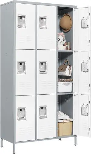 3 Tier Metal Lockers 3-Wide, 72" x 36" x 16" Storage Locker Units with 9 Compartments, Large Employee Locker with Shelves, Lockable Doors and Hanging Hooks Grey and White