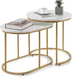 Giantex Modern Nesting Coffee Table Set of 2, Coffee Table & End Table Sets, Golden Steel Frame, Easy Assembly, Accent Marble-Look Stacking Side Table for Living Room Bedroom Apartment (Gold)