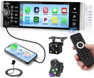5.1'' Single Din Car Stereo Carplay Android Auto, Hikity 1 DIN Car Radio IPS Touch Screen AM Radio Support Bluetooth FM/RDS Mirror Link SWC Voice Assistant AUX-in/USB/TF Backup Cam+MIC