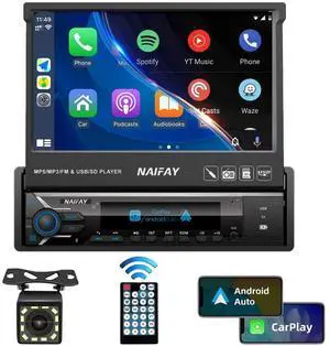 Naifay Single Din Touchscreen Car Stereo with Carplay & Android Auto, 7inch Flip Out Screen Car Stereo with Bluetooth Car Audio Receivers, Backup Camera, FM Radio/Mirror Link/USB/AUX/TF/Subwoofer