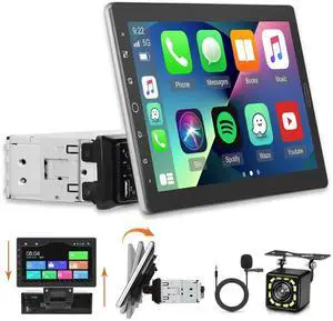10.1 inch Single Din Car Stereo with CarPlay and Android Auto, 10 inch Touch Screen Radio with Mirror Link/1080P/EQ Audio/SWC/Bluetooth +Backup Camera+MIC
