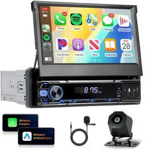Single Din Car Stereo Radio with AppIe Carplay Android Auto Airplay MirrorLink,Podofo 7inch 1080P Flip Out Car Radio Bluetooth FM Radio HD Backup Camera,2.0 USB,TF Card,AUX-in Ports,Support SWC