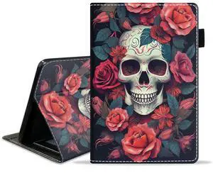 ZXHSBROK Case for Kindle Fire 7 Tablet (9th/7th Generation, 2019/2017 Release) 7" Display - Slim PU Leather Stand Folio Cover with Card Slot & Auto Sleep/Wake, Skull Roses