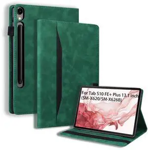 Flip Case for Samsung Galaxy Tab S10 FE+ Plus 2025 13.1 inch, PU Leather Stand Soft Back Smart Auto Wake/Sleep Cover,Adjustable Stand Shell w/Card Slots/Pen Holder/Front Pocket - Green
