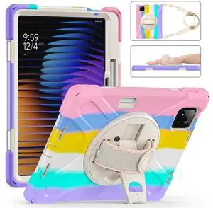 GooodiDEAR for Xiaomi Mi Pad 7/7 Pro Case, Shockproof Case with 360 Rotate Stand, Hand Strap, Shoulder Strap, Pencil Holder, Protective Cover for Tablet, Dazzling Pink