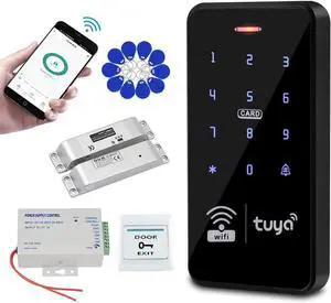 Tuya WiFi Waterproof Access Control System Kit RFID Keypad 125KHz 13.56MHz + Electric Drop Bolt Lock + 10pcs 13.56Mz Keyfobs, Smart Phone APP Remote Control
