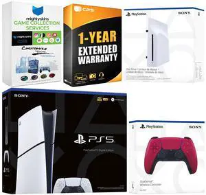 Sony PlayStation 5 Slim Digital Bundle with Disc Drive, Extra Controller, Vertical Stand, MightySkins Game Collection Services and 2 Year Extended Warranty - Cosmic Red