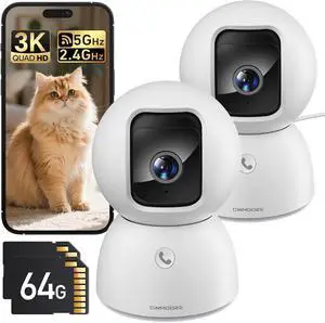 2 Pack 3K Indoor Security Camera with 64GB SD Card, AI Human & Pet Detection, Auto Tracking, 5G/2.4G Dual WiFi, Pan Tilt, Two-Way Audio, Local Storage, Free Basic Plan, Optional Subscription