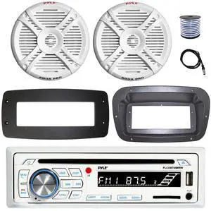 Pyle PLCDBT65 Single DIN Bluetooth Marine CD Stereo Receiver, Spa bezel, Adapter Plate, 22" Radio Antenna, Wire, 2x 4" 30 Watt Peak Water-Resistant 3-Way InDoor/OutDoor Audio Speakers (White)
