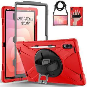 Gerutek Case for Samsung Galaxy Tab S11 Ultra 2025 14.6", Full-Body Drop Protective Case with Screen Protector, Pen Holder, 360 Rotate Hand Strap & Stand,Shoulder Strap, Red