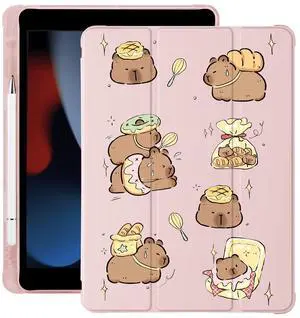 Cute Kawaii Capybara for iPad 7th/8th/9th Generation Case with Pencil Holder, Auto Sleep/Wake, Pink Leather Soft TPU Back Cover for iPad 10.2 Inch 2019/2020/2021