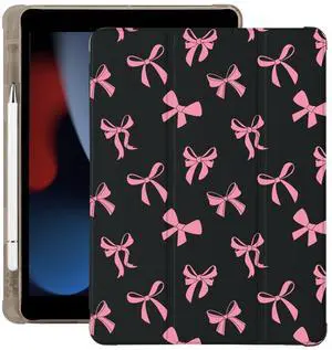 Cute Kawaii Bow for iPad 7th/8th/9th Generation Case with Pencil Holder, Auto Sleep/Wake, Black Leather Soft TPU Back Cover for iPad 10.2 Inch 2019/2020/2021