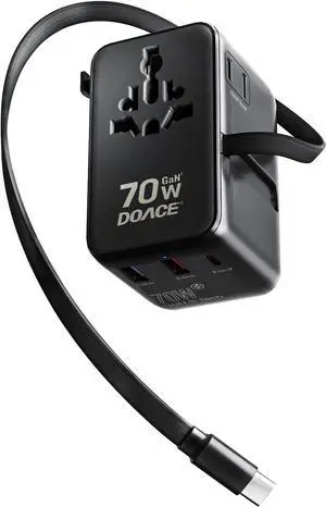 Universal Travel Adapter, 70W GaN 3.0 European Travel Plug Adapter with Built-in USB-C Cable, 6 in 1 International Power Adapter USB-C PD Fast Charging for EU/UK/USA/AUS