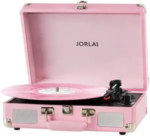 JORLAI Pink Vinyl Record Player 3 Speeds Portable Suitcase Turntable with Built-in Dual Speakers, Bluetooth Gramophone with Built-in Battery 3.5mm Aux Input/RCA Output