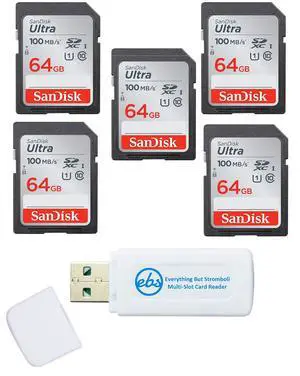 SanDisk 64GB SD Ultra Memory Card (5 Pack) UHS-I Class 10 SD Memory Card (SDSDUNR-064G-GN6IN) Bundle with (1) Everything But Stromboli Combo Card Reader
