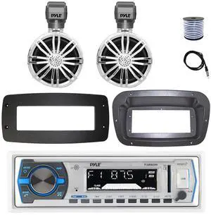 Pyle PLMRB29W Single DIN Bluetooth Marine MP3 Stereo Receiver, Spa bezel, Adapter Plate, 22" Radio Antenna, Wire, 2x 2.25" 10W Max Full Range Waterproof Off-Road Audio Speakers (White)