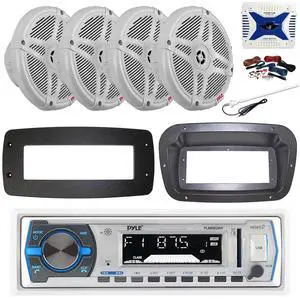 Pyle PLRMR27BTB Single-DIN Marine Bluetooth USB/AUX MP3 AM/FM Radio Stereo Receiver W/Install Kit + Adapter Plate, 4x 3.5" 300W Max Power Indoor/Outdoor Speakers, 4 Channel Amplifier W/Kit, Antenna