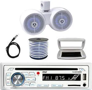 Pyle PLCDBT65 Single-DIN Marine Bluetooth USB/AUX CD Player AM/FM Stereo Receiver W/White Cover, Dual 6.5" 200W Max Power 2-Way LED Off-Road Tower White Speakers W/50 Feet 18G Wire, 22" Radio Antenna