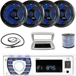 Pyle PLRMR23BTW Single-DIN Bluetooth Marine USB/AUX MP3/SD AM/FM Radio Stereo Receiver W/White Cover, 4x 6.5'' 150 Watt Max Power Dual Cone RGB LED Boat Audio Black Speakers W/50 Feet Wire, Antenna