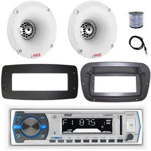 Pyle PLMRB29W Single DIN Bluetooth Marine MP3 Stereo Receiver, Spa bezel, Adapter Plate, 22" Radio Antenna, Wire, 2x 6.5" 90 Watt Peak Power 2-Way Full Range Audio Speakers (White)